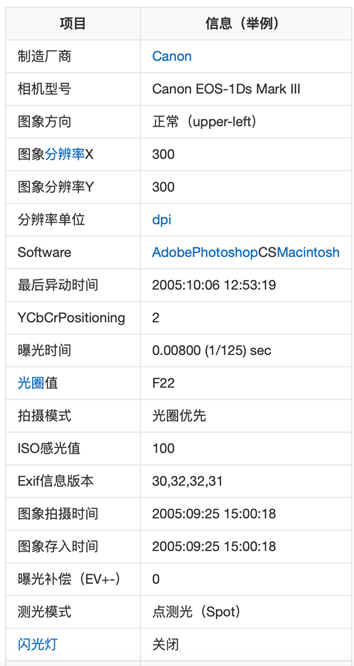 EXIF是可交换图像文件的缩写 ,这是专门为数码相机的照片设定的。它可以记录数码照片的属性信息和拍摄数据,增加有关数码相机拍摄信息的内容和索引图或图像处理软件的版本信息。这其中就包含了部分个人信息,例如使用的相机或手机的品牌、照片拍摄的位置、照片曝光时长及色温等。