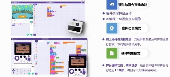 除此以外,威栗云还利用威盛电子核心技术优势,为小栗方带来舞台互动模式和仿真模式,实现硬件实时舞台互动、硬件仿真器模拟、硬件实时舞台互动等功能。而威栗派则增添烧录(仿真)模式,除了可以进行硬件仿真模拟外,还能进行舞台编辑功能,离线烧录屏幕1:1显示。