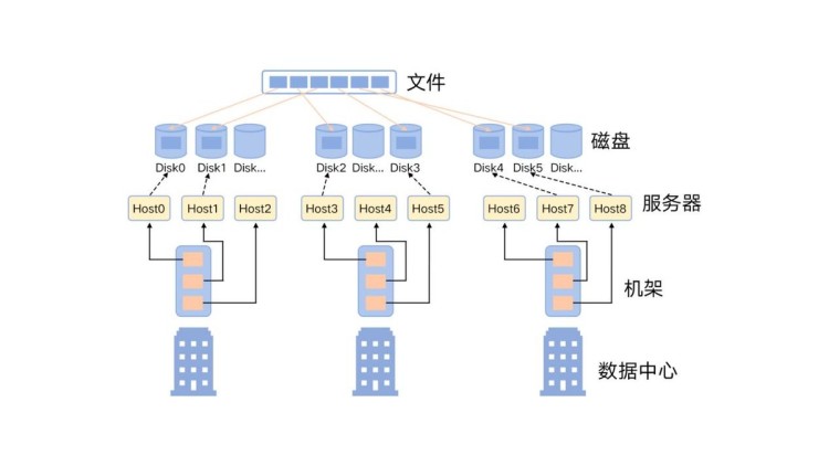 当ZOS进行文件存储时,会以对象的方式将每个文件切片,并通过Hash计算保证这些分片均匀离散地映射到每个存储节点、每块硬盘上。在存储单元的选取上,可以根据每个硬盘所在服务器、机架、机房进行识别性选取,进而在多个物理层级上满足服务可靠性的要求。