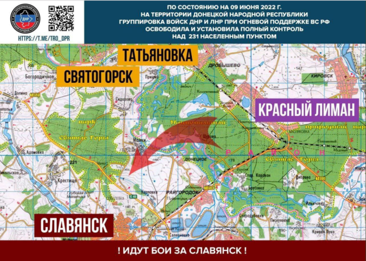 报道称,截至6月9日,“顿涅茨克人民共和国”和“卢甘斯克人民共和国”的一批部队在俄军火力支援下,已全面控制了顿涅茨克人民共和国境内的斯维亚托戈尔斯克、塔季扬诺夫卡等231个地方。争夺斯拉维扬斯克控制权的战斗正在进行中。