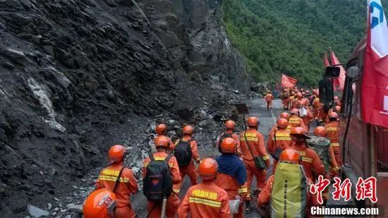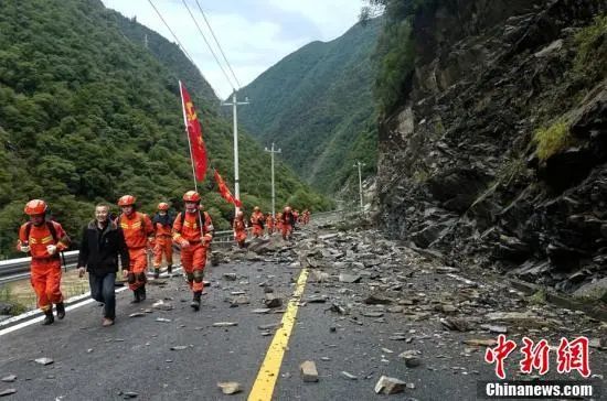 据了解,受震后持续降雨影响,阿坝州马尔康市脚木足乡通往震中草登乡道路多处发生塌方,导致救援车辆无法前行。为尽快抵达震中了解灾情和开展抗震救灾工作,四川省森林消防总队先后派出两路前突小队冒雨徒步挺进震中。图为徒步赶赴震中开展救援的森林消防。