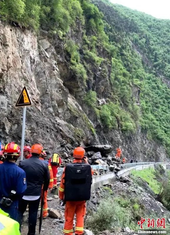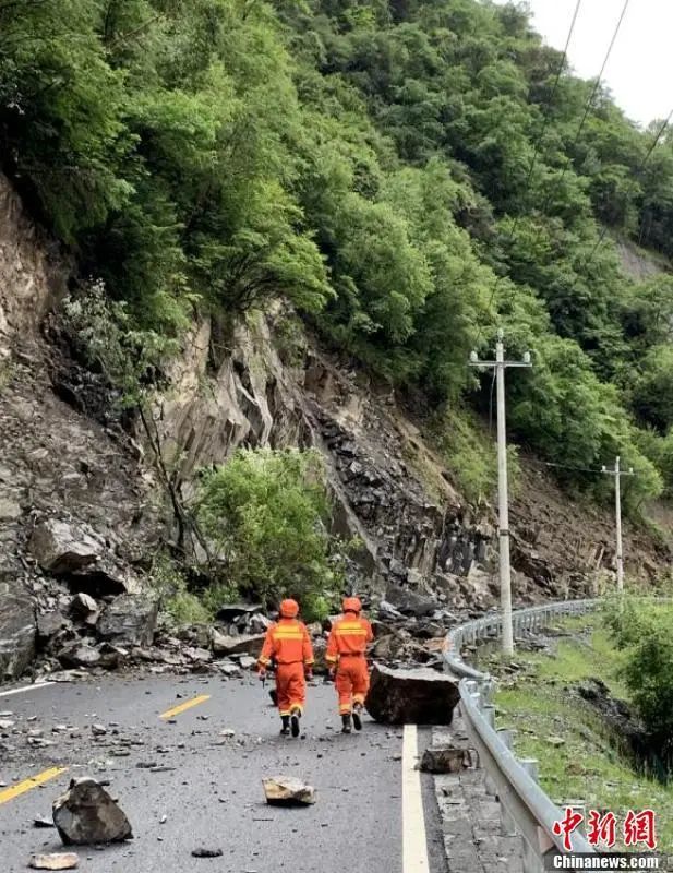 地震致使马尔康至震中草登乡道路多处中断,消防员抢修道路。