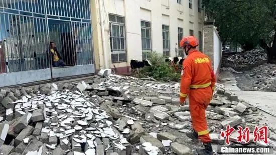 震中倒塌的围墙,森林消防员正在排查险情。愿平安!