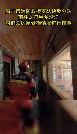 6月10日14时05分,眉山消防快反分队在前往龙甲乡沿途对群众房屋受损情况进行排查,并提醒群众警惕余震及滑坡,注意安全。