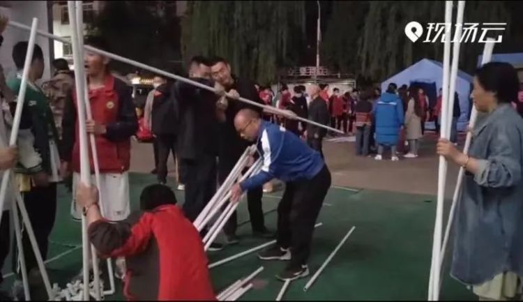 马尔康市第二中学校老师组织寄宿制学生在操场搭建帐篷。