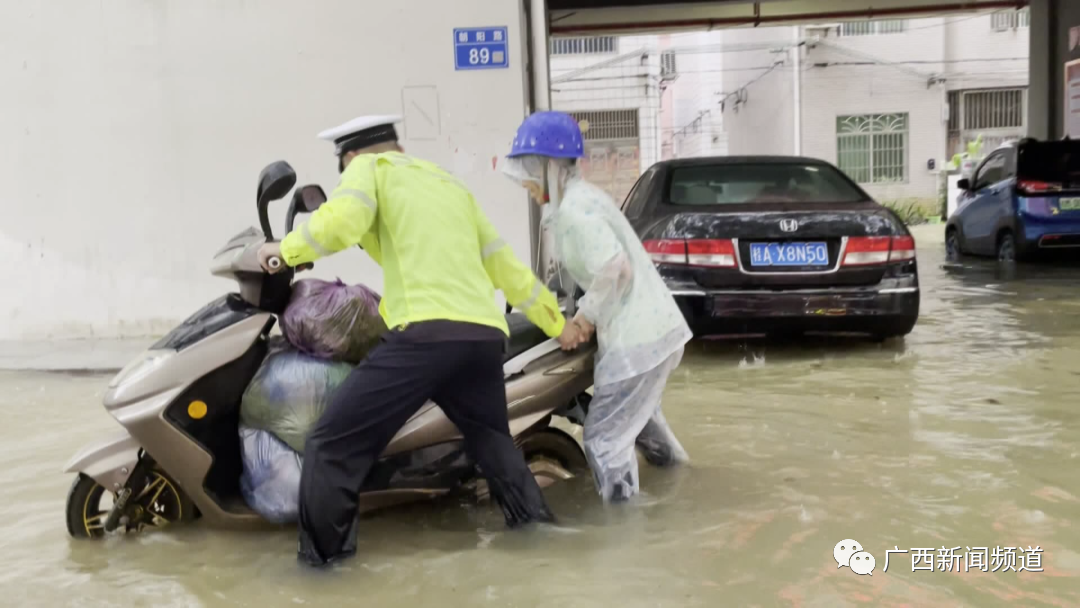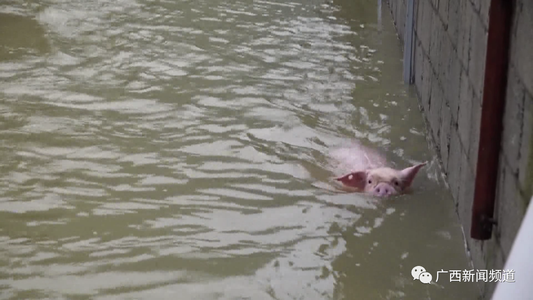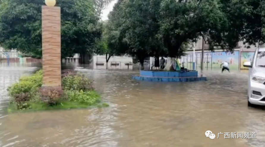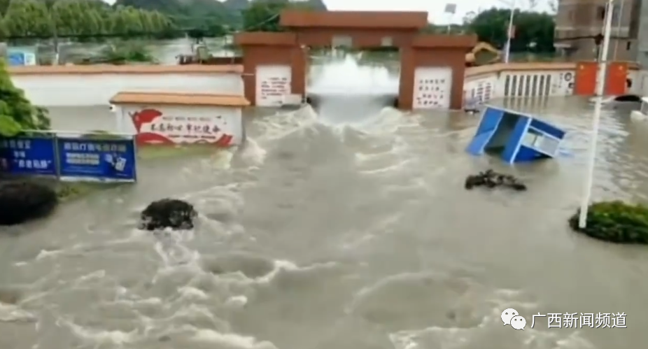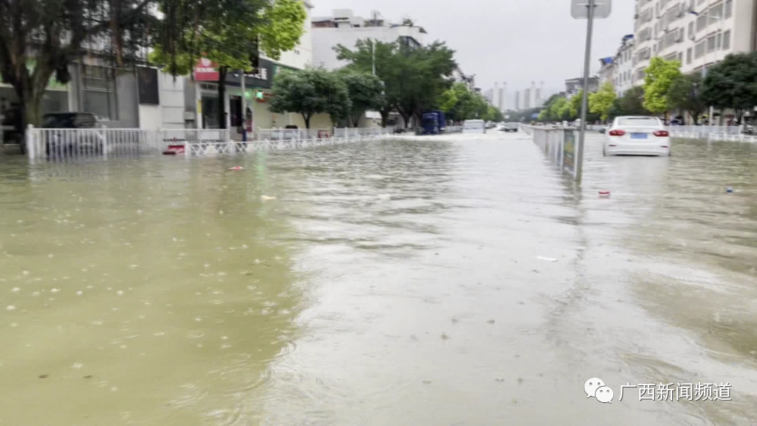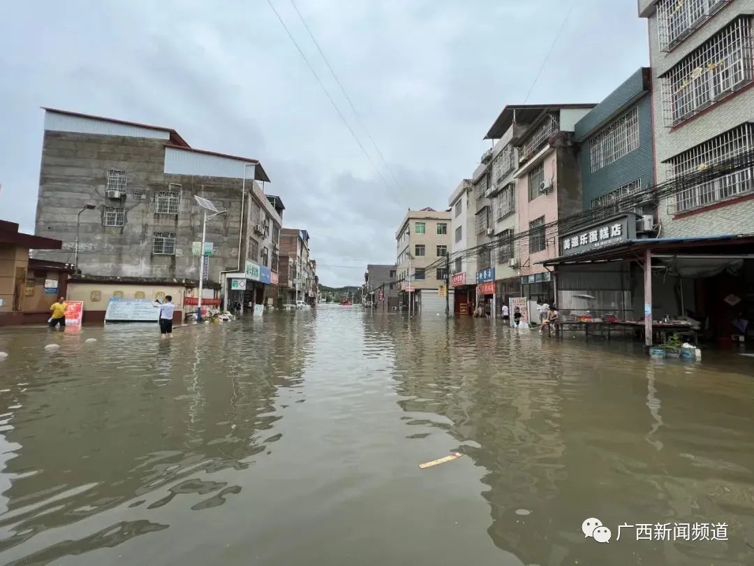 强降雨还致使来宾市兴宾区南泗乡受灾严重,近300多米的主街道地段全部淹没在洪水中,街道上多辆汽车被困。临街住房、商铺都遭到了洪水的侵袭,南泗中学校园操场是一片汪洋。