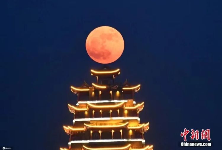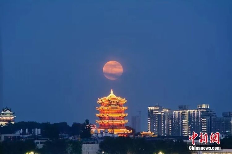 6月14日,武汉汉阳江滩,黄鹤楼悬月,超级月亮现身天宇。图片来源:视觉中国