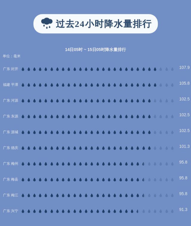 14日05时-15日05时的降水量前十位排行中,广东占了九个。