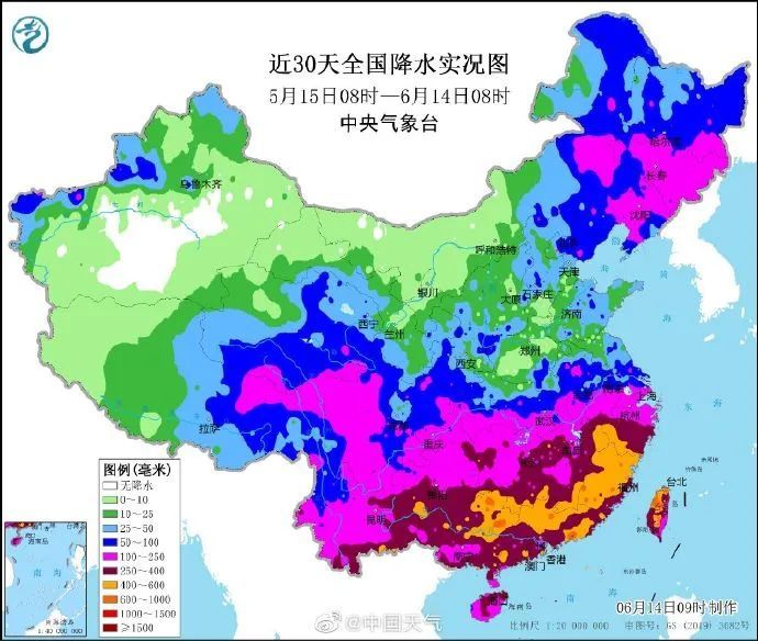 近30天全国降水实况图(5月15日08时-6月14日08时) 来源:@中国天气