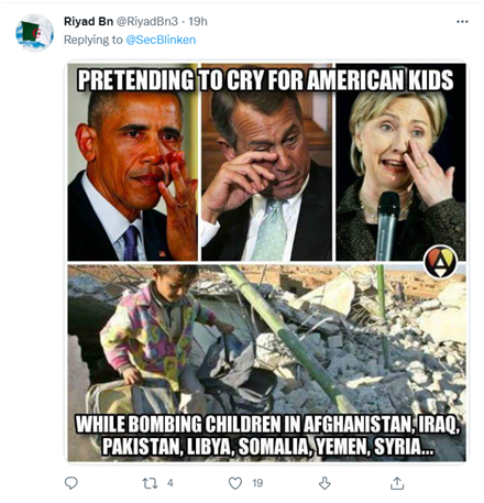 一位以阿尔及利亚国旗为头像的网民放出了一张照片,照片上方是西方多位领导人“哭泣”的动作,而下方则是一个小女孩站在被炸毁的废墟上,图片配文称“你们假装为美国孩子哭泣,却一边轰炸其他国家的孩子。 ”