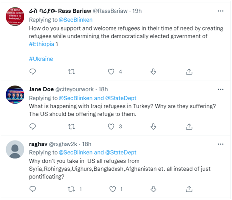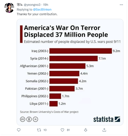 另一位网友则列出了一张柱状图,上面显示了美国以“反恐战争”为名,导致伊拉克、叙利亚和阿富汗等国家有3700万人流离失所变成难民的数字。这位网友“回敬”布林肯所谓的“帮助难民”道:“谢谢你们在(制造)难民上的贡献”。