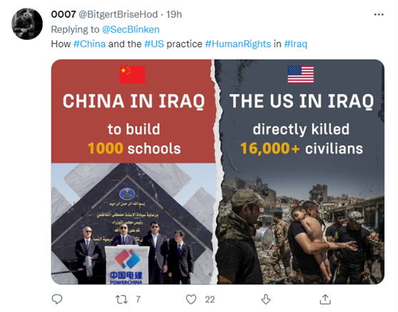 也有列数据的网友联想到了中国,他发布了一张对比图,一边是中国在伊拉克盖1000所学校的数字,另一边的数据则是美军在伊拉克直接杀死了1.6万平民,他评论道:这就是中美两国在伊拉克“践行人权”干的事情。