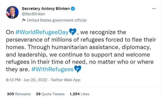 6月20日,美国国务卿布林肯在社交媒体就“世界难民日”发文,称全球每年有数以百万计的难民被迫背井离乡,而美国将通过各种途径帮助这些难民。然而,来自各国的许多网民却并不认同布林肯的这套说辞,反倒是在评论区给他“算了一笔账”。