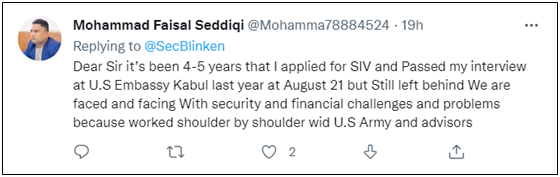 在布林肯的评论区也有自称遇到类似情况的人跑来诉苦,他对布林肯喊话:“亲爱的先生,我在过去四五年一直向美国驻阿富汗大使馆申请避难签证,但一直没有通过,我因为和美军共同战斗过,导致现在遇到了安全和经济问题。 ”