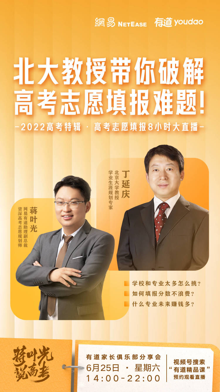 高考已经结束,接下来的志愿填报将是全国一千万考生的头等大事。为帮助考生科学填报高考志愿,网易有道公司推出“有道领世志愿填报系统”,基于学生不同的学业规划路径,通过大数据分析、录取概率测算,为学生提供可靠指导,帮助他们找到志愿填报的“最优解”,踏实稳重地走出人生发展的关键一步。据了解,6月25日下午2点至4点,网易有道助理副总裁、资深高考志愿规划师蒋叶光与北京大学教授、学业生涯规划专家丁延庆将在“有道精品课”官方视频号为考生在线答疑。