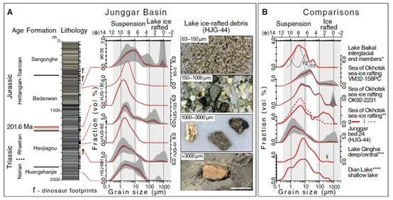 巧合的是,研究团队在准噶尔盆地晚三叠世至早侏罗世的层位中,同时发现了恐龙脚印和冰筏沉积。