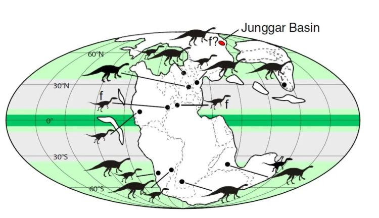 研究团队重新校正了准噶尔盆地的古纬度,认为其晚三叠世至早侏罗世位于潘吉亚大陆的北极地区(约北纬71度)。在野外考察中,他们首次在准噶尔盆地晚三叠世至早侏罗世湖沼相泥岩中,发现了保存精美的恐龙脚印化石。