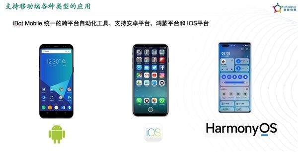 iBotMobile3.0具备广泛的适用性,首先作为统一的跨平台自动化工具,它能够全面支持安卓平台,鸿蒙平台和 iOS平台三大平台,其中对iOS的支持为国内首创;其次iBot Mobile3.0 支持多种类型的移动应用,支持H5 应用,支持原生APP,支持混合APP和微信小程序,这意味着iBot Mobile3.0在APP应用场景上实现了0门槛0障碍的全准入,真正意义上实现了移动APP与RPA产品的融合。