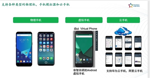 iBotMobile3.0另一大创新点是它不仅可以支持各种物理手机,还能支持虚拟机和各种云手机,容智iBot Mobile 自带了PC上的虚拟手机iBotVitual Phone,在电脑上直接运行手机APP,无需额外连接硬件手机也可以进行手机APP的自动化操作,仅这一项就能为用户节约大量硬件采购和折旧成本,并加速项目实施进程,真正能够有效的帮助客户降低使用成本,提高使用效率。 同时,针对企业级客户私有化的部署,iBot Mobile 提供基于私有化环境部署的私有云手机集群,在一台Linux 服务器上面可以运行十几个或者上百个虚拟手机。 也是RPA行业首家可以提供私有云和公有云手机的RPA厂商。