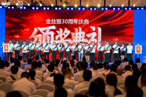 7月12日下午的金丝猴食品30周年表彰大会上,金丝猴食品邀请公司优秀员工代表和全国优秀经销商代表前来参会,共同见证金丝猴食品的荣耀时刻,感恩他们长久陪伴,并为他们一一颁奖。