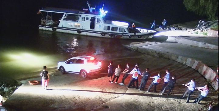 深夜,面对稍有不慎就会坠入江中的轿车,他们齐心协力,用“拔河”式救援,将轿车成功拖离水岸。