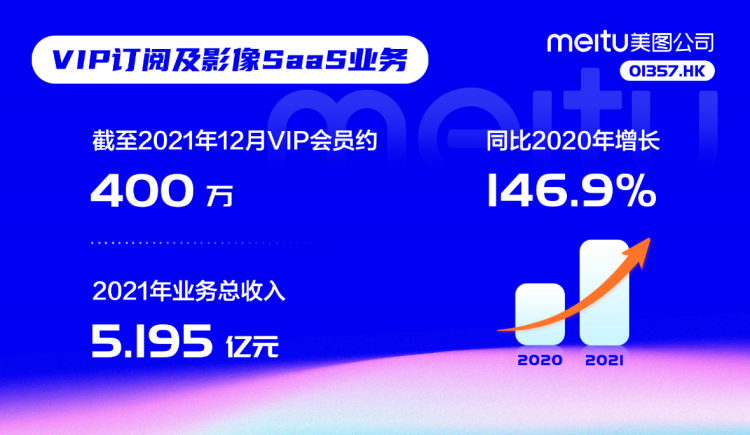 据美图公司此前公布的2021年全年业绩,VIP订阅业务增势迅猛,已成为美图公司开拓商业空间的全新驱动力。数据显示,该业务2021年实现收入人民币5.195亿元,同比大增146.9%。