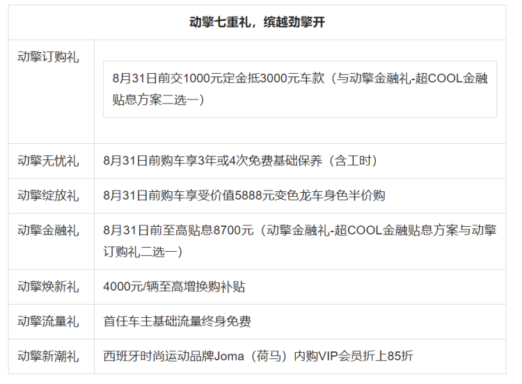 在公布售价的同步,吉利汽车也为缤越COOL用户推出了“动擎订购礼”“动擎无忧礼”“动擎绽放礼”“动擎金融礼”等七重购车礼遇,具体如下: