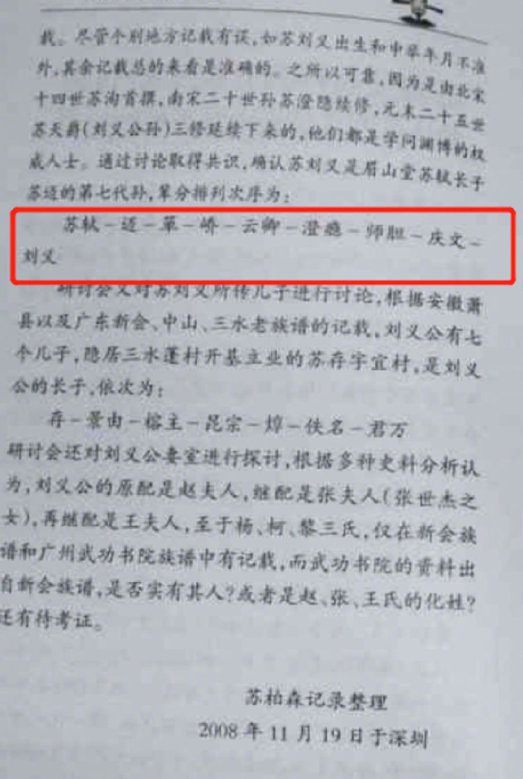 此外,南宋将军苏刘义也是争议人物。记者发现一本《眉山堂·苏氏世家》,里面记载的源流是:轼→迈→箪→峤→云卿→澄隐→师旦→庆文→刘义。该书由安徽苏刘义的后人编写。公开资料显示,苏肇平是安徽省眉山堂苏氏宗亲总会会长,苏轼的第三十世孙。苏肇平告诉记者他们和广东省中山市古镇的苏氏是同宗,都是苏刘义的后人,苏刘义是苏轼的后人。苏刘义是南朝的大将军,南宋灭亡时,苏刘义的一个儿子(苏景由)到了广东那边,一个在安徽这边。