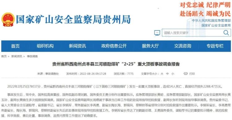 2022年2月25日7时37分,贵州省黔西南州贞丰县三河顺勋煤矿(以下简称三河顺勋煤矿)发生一起重大顶板事故 ,造成14人死亡 ,直接经济损失2288.47万元。
