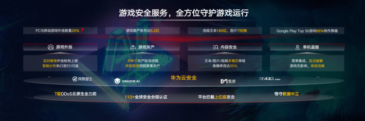 针对游戏运行阶段,华为云提供了适配游戏上线期、业务高峰期和游戏上线后等各业务阶段的解决方案,保障游戏稳定弹性部署和无忧运维。同时,华为云协同生态伙伴共创了游戏外挂、游戏灰产、内容安全、单机盗版以及云上安全等场景化解决方案,全方位守护游戏运行。