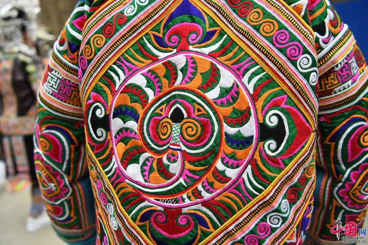 身穿“百鸟衣”的苗族姑娘(背面)。“百鸟衣”为无领衣;苗语称“欧花闹”(女装),整件衣服用丝线绣着五颜六色各种造型鸟图案组成,女装为前后几幅条带的“鸟龙”组成。王炳真 摄影