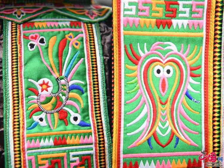 苗族“百鸟衣”局部。百鸟衣服饰图案丰富,原始古朴,色彩以绿缎为底,桔红、黑、浅黄和白色花饰为基调,是苗装中的精品。百鸟衣一般在祭祖大典——鼓藏节上为仪仗队的芦笙手穿著用服,如今在年节或其它庆典中亦有使用。王炳真 摄影