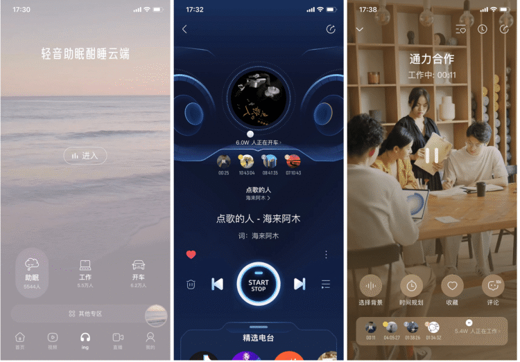 进入产品中不难看出,酷我音乐推出的“助眠、开车、工作”三大场景是用户日常偏好较强、音乐渗透率较高的使用场景。在“ing助眠场景”中,用户可以选择自然景声、白噪音等多种类型的音乐,营造助眠氛围,帮助快速入眠;在“ing开车场景”中,用户不但有音乐、DJ、小说、相声等各类音频陪伴驾驶,还可以根据不同的路程及陪同人员来选择音乐类型;进入到“ing工作场景”,酷我音乐则会提供相对安静、更能激发用户思维潜力的轻音乐,还支持自选背景、时间规划、互动评论等功能,帮助用户专注工作内容,同时彼此交流、相互陪伴。