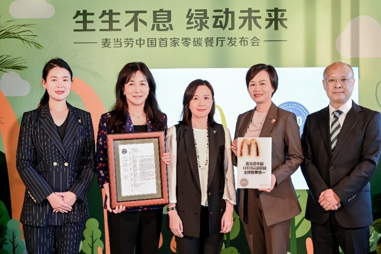 (从左至右:美国绿色建筑委员会北亚区副总裁王婧、麦当劳中国首席影响官顾磊、麦当劳中国首席执行官张家茵、麦当劳中国首席发展官梁海静、美国绿色建筑委员会北亚区董事总经理杜日生)