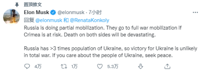 不久马斯克再度发推并置顶该推文,他表示,“俄罗斯正在进行部分动员。如果克里米亚有危险,他们会进行全面战争动员。双方的死亡都将是毁灭性的。”马斯克接着说道,“俄罗斯的人口是乌克兰的3倍,所以乌克兰不可能在全面战争中取得胜利。如果你关心乌克兰人民,那就寻求和平吧。”