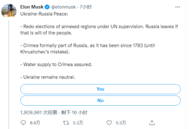 马斯克在推文中写道:“乌克兰-俄罗斯和平”,并列出了4项建议,分别为1.在联合国监督下就“被强占地区”重新进行公投,如果这是人民的意愿,俄罗斯离开。2.克里米亚正式成为俄罗斯的一部分,就像自1783年起一直以来的那样。3.克里米亚供水得到保证。4.乌克兰保持中立。在推文下方,马斯克还设置了一个投票来让网友表达是否支持他的建议。