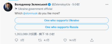 报道称,马斯克提出的建议引发了包括乌克兰总统泽连斯基在内的乌克兰官员强烈反对。前乌克兰驻德国大使梅利尼克在回应马斯克的推特时写道:“滚蛋是我对你非常外交的回复。”泽连斯基在推特上艾特马斯克并问道“你更喜欢哪个马斯克?”下方的2个选项分别为支持乌克兰的和支持俄罗斯的。