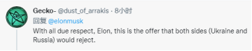 在推特下方,有网友对马斯克的投票表达看法称,这是俄乌双方都会拒绝的提议。↓