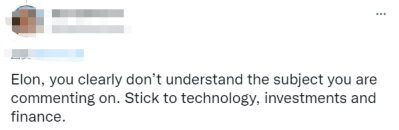 “埃隆,你显然不明白你在评论的主题。(你还是)关注技术、投资和金融吧。”