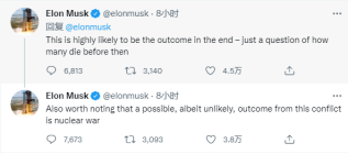 马斯克随后继续发推称,这(以上建议)极有可能是最终的结果——问题是在这之前有多少人会死亡。“同样值得注意的是,这场冲突可能(尽管不太可能)的结果是核战争。”
