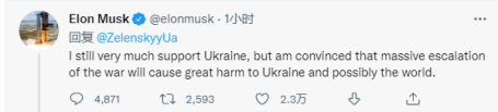 马斯克在泽连斯基的推文下评论称,“我仍然非常支持乌克兰,但我相信,战争的大规模升级将对乌克兰乃至世界造成巨大伤害。”