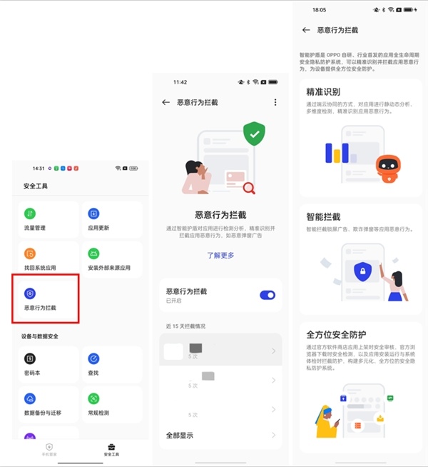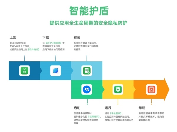 目前,智能护盾已打通了ColorOS系统,以及OPPO软件商店、浏览器、手机管家、游戏中心等多款应用,构建了全方位、系统级的纵深防护体系。
