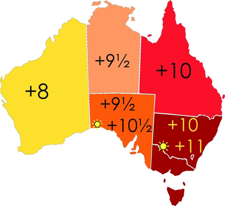澳大利亚大陆的3个时区基本上以州为单位划界。其中,昆士兰州、新南威尔士州、首都领地、维多利亚州和塔斯马尼亚州划归为澳大利亚东时区+10:00,比北京快2小时;南澳大利亚州和北领地划归为澳大利亚中时区+9:30,比北京快1.5个小时;西澳大利亚州划归澳大利亚西时区+8:00,且不采用夏令时,因此与中国的北京时间始终保持一致。