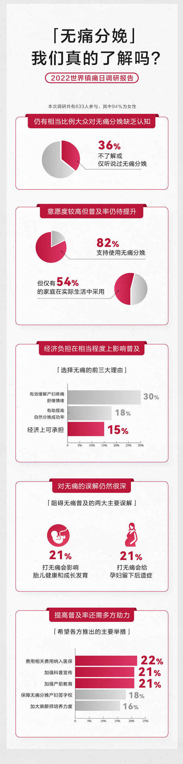 但据最新调研数据显示,仍有36%的人不了解或仅听说过无痛分娩,存在认知空白。仍有不少人对无痛分娩技术存在误解和偏见。尽管有82%的人在调研中表示愿意选择使用无痛分娩,但事实是,全国无痛分娩的整体普及率只有30%,仍有近七成女性承受着分娩疼痛。推动无痛分娩的全国普及仍需多方合力。