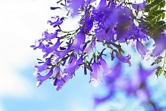 蓝花楹以其空灵的蓝紫色花朵而闻名,名字来自葡萄牙语,意思是“香甜的、芬芳的”。特有的铃铛形花朵成簇生长,一个枝头可以挂上几十个小铃铛。它们的叶子类似于蕨类植物,对生,颜色为深绿色。花开到最盛时,几乎看不到叶子,只见繁花满树,仿佛置身婚礼现场的盛大拱门。一阵微风拂面,落英缤纷,铺织成紫色的地毯,天上地下共享春色。