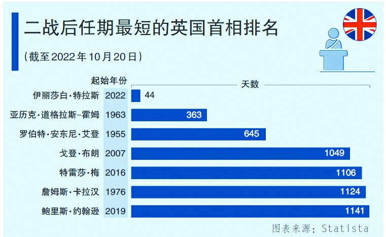 【环球时报综合报道】“这是一个灾难性首相任期的耻辱结尾”“特拉斯走了,但英国政治和经济混乱仍在继续”“英国的政治动荡破坏了它实用主义的形象”……尽管本周以来有关英国首相特拉斯很快辞职的猜测满天飞,但当她20日正式宣布辞职后,国际舆论场依旧震动不已。自2016年举行“脱欧”公投以来,英国已有4名首相黯然下台;在短短不到4个月时间里,执政的保守党举行两次党首选举。根据议会下院保守党议员团体“1922委员会”公布的竞选规则,英国下一任首相人选最迟在本月28日揭晓,正好赶在财政大臣亨特宣布中期财政计划之前。特拉斯的短暂执政似乎将英国政治动荡推向一个高潮,外媒开始集中审视“脱欧”让英国吞下了怎样的苦果。美联社评论说,英国重新定义自己的努力已经偏离了轨道。与25年前“酷不列颠”称号相距甚远的是,这个国家现在经常被称为“破碎的英国”。不过在一名德国驻英记者看来,特拉斯的“戏剧性失败”或许能意味着“一厢情愿的想法的终结”,而这正是“英国转折点的开始”。