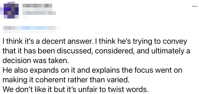 还有人说:“我认为这是一个合理的答案。我认为他想表达的是,这件事已经经过制作方讨论和考虑,并最终做出了决定。他还解释了比起多样性,更重要的是合乎逻辑。我们不喜欢这样,但对这说三道四是不公平的。”