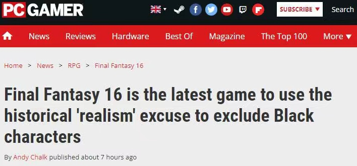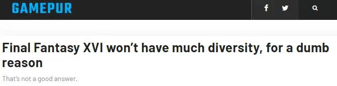 美国游戏媒体“gamepur”则直接在文章标题中将吉田给出的理由描述为“愚蠢”,文章称,“多年来,《最终幻想》系列的游戏角色缺乏多样性是出了名的”,这个系列中能让人想得到的有色人种角色很少。文章指责称,“根据《FF16》的预告片,人们可以看到这个趋势没有改变,现在我们知道了原因,而这不是一个很好的理由”。