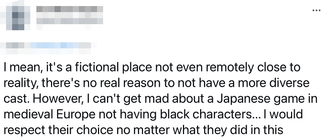 吉田的解释同样在网络上引发讨论,值得注意的是,在有一些网友批评他的同时,也有一些人持不同意见。有网友评论称:“这是一个虚构的地点,根本不接近现实,没有一个真正的理由让游戏不拥有更多样化角色。然而,我不能因为一个以中世纪欧洲为基础的日本游戏没有黑人角色而生气……不管他们在这里面做了什么,我都会尊重他们的选择”。