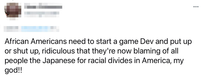 更有网民评论说:“非裔美国人需要容忍并去做游戏,要不然闭嘴。可笑的是他们现在把美国的种族分歧归咎于日本人,我的天啊!!”